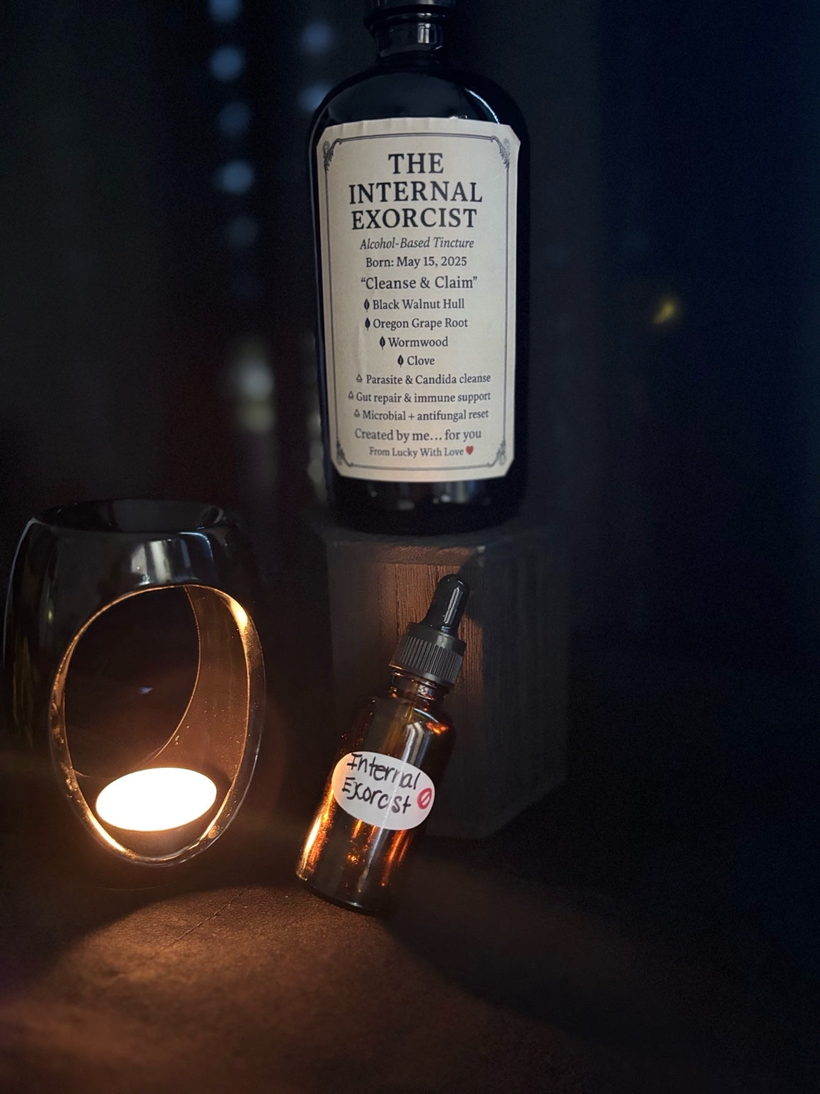 The Internal Exorcist is a potent, plant-powered gut cleanse tincture designed to clear, reset, and restore balance from within. Handcrafted in small batches, this alcohol-based tincture combines Black Walnut Hull 🌰, Oregon Grape Root 🍇, Wormwood 🌿, and Clove 🌸—four powerful botanicals traditionally used for parasite cleansing, microbial balance, and digestive repair.